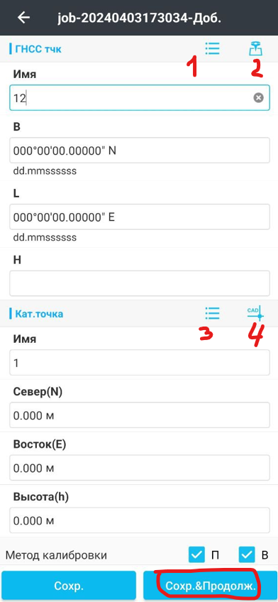 Шаг 3. В строке "ГНСС точка" - выберите из списка измеренную. В строке "Кат. точка" - выберите из списка эту же точку с каталожными координатами и нажмите кнопку "Сохранить&продолжить" 1 - Вы можете выбрать измеренную точку из списка (если измерили ее заранее) 2 - Вы можете измерить точку непосредственно через это меню 3 - Вы можете выбрать каталожную точку из списка (если импортировали или добавили ее заранее) 4 - Вы можете выбрать точку с карты или подложки. | ![]() |