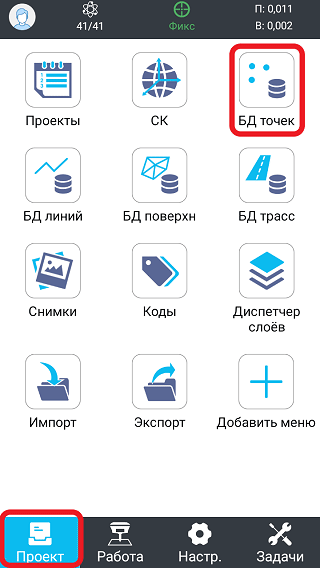1. Перейдите в меню "Бд точек" на странице "Проект",