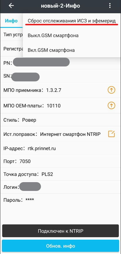 3. Нажмите три точки справа сверху и выберете «Сброс отслеживания ИСЗ и эфемерид»