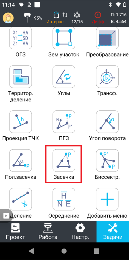 2. Для расчёта координат недоступной точки воспользуйтесь функцией «Засечка» из меню «Задачи» (рисунок 2).