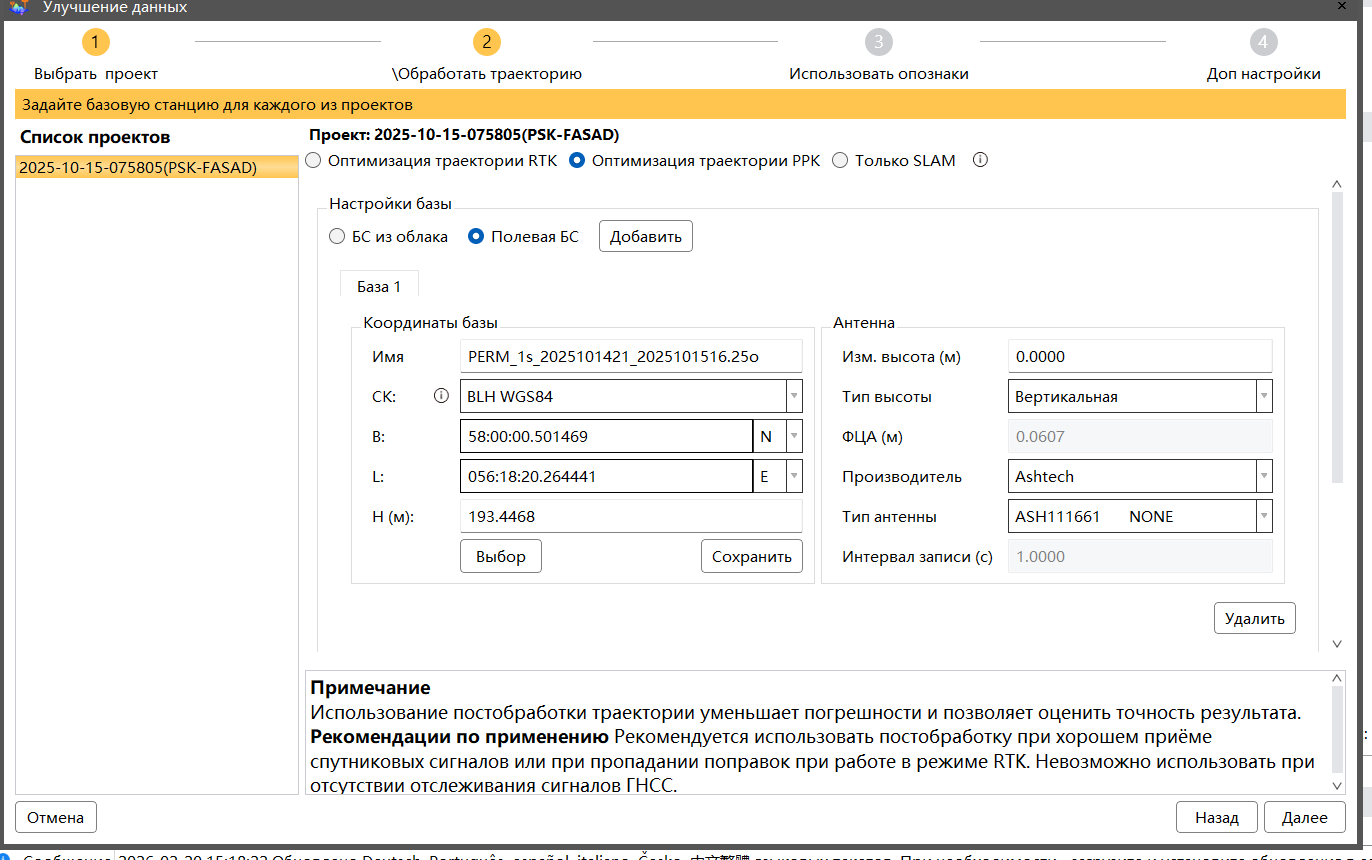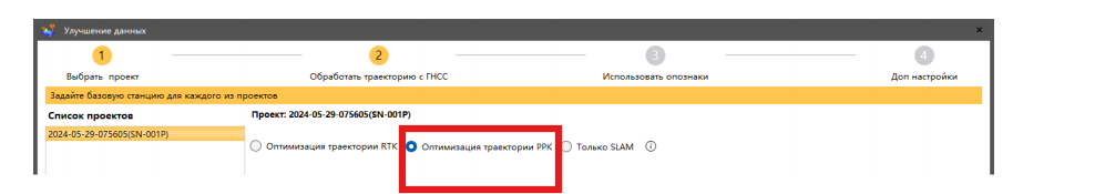 2. Выбрав проект для обработки, во вкладке «Обработать траекторию с ГНСС» выберите пункт «Оптимизация траектории PPK».